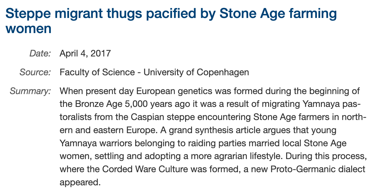 The suggested plot is that they were ruthless warriors who started spreading from the steppes some 5000 years ago in different directions, and wherever they went, whoever survived ended up becoming more brutal and more militarized.